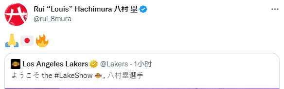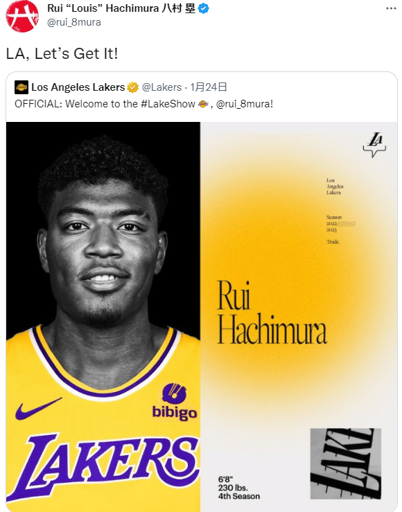 八村垒正式成为湖人队的一员,转发湖人欢迎他加盟的动态,并且写道:湖人队,让我们一起开始吧。
