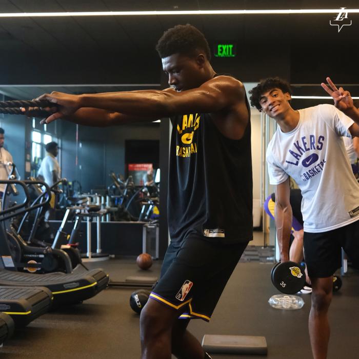 湖人官方晒出多名球员的训练照,在健身房中威少苦练核心力量,T恤已经被汗浸湿了;托马斯-布莱恩特训练时,湖人新秀克里斯蒂拿着哑铃比V抢镜。