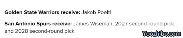 来源:360直播08-25 20:40360直播08月25日讯 随着杜兰特逼宫闹剧的结束,联盟还会有什么交易发生吗?北京时间8月25日,美媒Bleacher Report支招勇士3换1升级内线,来提升新赛季卫冕的概率。具体方案是勇士说送出怀斯曼、2027年次轮签和2028年次轮签,得到马刺中锋珀尔特尔。