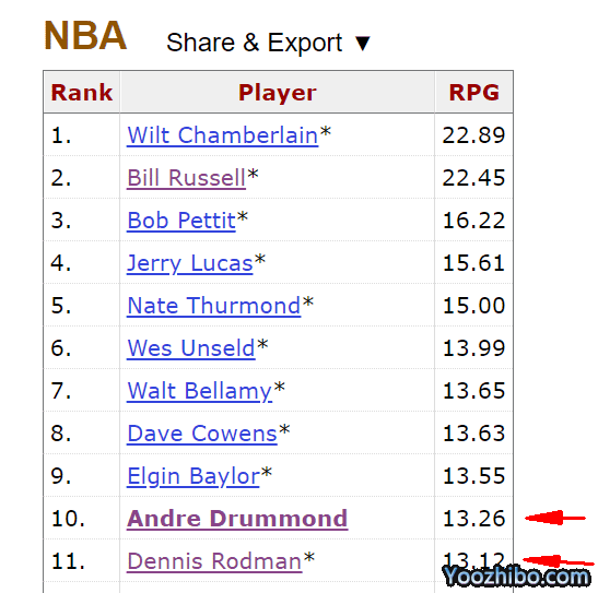 把这个数据放在历史上呢。当然,不同时代的篮球不一样,抢篮板的难度系数也不同。抛开年代的因素,场均13.3个篮板能在历史上排名第几?答案是排在第10位。