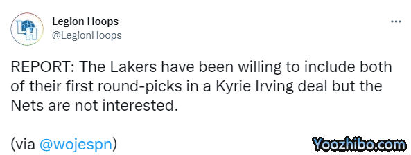 沃纳罗斯基透露,佩林卡仍在积极打电话寻求交易,这可能持续到训练营和赛季初,现在湖人愿意把2027年和2029年首轮选秀权加入欧文交易之中,可篮网对此不感兴趣;该记者还表示湖人不愿用两个首轮签去引援希尔德和迈尔斯-特纳,无论任何交易,湖人都需要送走威少。