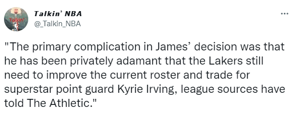 对于詹姆斯续约,湖人随队记者Jovan Buha表示,詹姆斯做出续约决定最复杂的地方在于,他私下里仍坚持认为湖人仍然需要改进现有阵容并交易得到欧文。