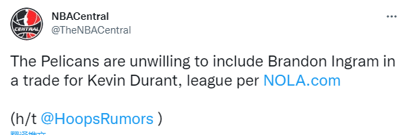对于杜兰特交易,鹈鹕记者Christian Clark重申,鹈鹕不愿意将布兰登-英格拉姆放进在杜兰特的交易中。