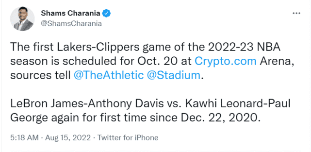 来源:360直播08-15 15:44360直播08月15日讯 ,名记Shams报道称,多位消息人士透露,2022-23赛季常规赛湖人与快船的首次交手将在10月21日(北京时间,下同)进行。这将会是自2020年12月23日以来,詹姆斯+戴维斯的组合首次对阵莱昂纳德+乔治的组合。时隔667天,湖人和快船的双核将一决高下!