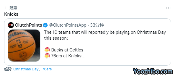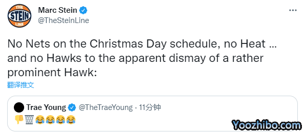 老鹰无缘年终大战,球队核心球星特雷-杨沮丧不满,发推晒出倒竖大拇指以及4个笑哭的表情;名记Marc Stein发推回应:年终大战赛程上没有篮网,没有热火,也没有老鹰队,这老鹰球星明显感到沮丧。