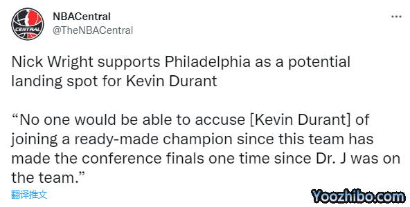 对于76人,杜兰特会说,‘是的,我们能赢得总冠军,顺便说一下,因为我加盟了一支,自朱利叶斯-欧文时代后只进了一次分区决赛的球队,所以没有人会指责我加入了一支现成的冠军队伍。’我理解为什么选择76人会对杜兰特有利。