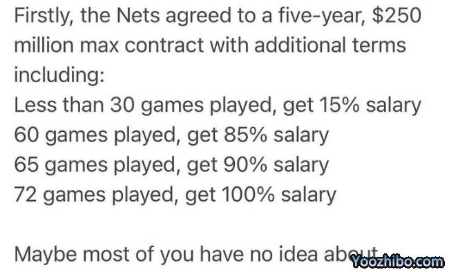 据欧文好友yingkopin透露,篮网曾同意5年2.5亿美元续约欧文,不过附加条款导致双方签约失败;具体的附加条款是:单赛季出场少于30场比赛,可拿到15%的年薪;出场达到60场,可拿到85%的年薪;出场达到65场可拿到90%的薪水,出场达到72场才能100%拿到年薪。
