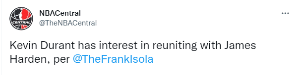 杜兰特曾招募哈登加盟篮网,无奈篮网三巨头仅合作一年多就解体,21-22赛季哈登中途离队并且加盟76人;如今杜兰特愿意前往76人并且想要与哈登一起继续合作。