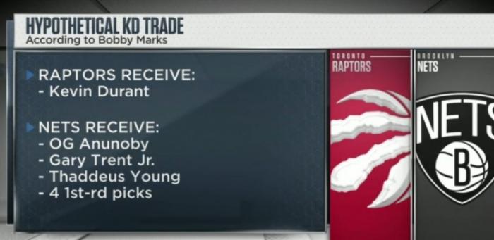 由于杜兰特没有交易决定权,薪资专家Bobby Marks晒出了篮网与猛龙之间围绕KD交易的一套可行方案:猛龙送出OG-阿努诺比、特伦特和赛迪斯-杨,再加上4个首轮签,从篮网得到KD;专家建议猛龙7换1引援杜兰特;很明显,杜兰特交易重启,究竟他会被交易到哪支球队?也许很快就有结果了。