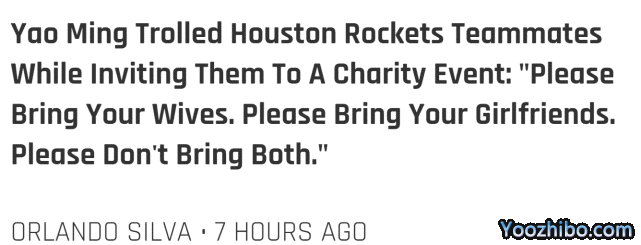 “姚明有个很棒的笑话。当时,他举办了一场慈善活动,”巴蒂尔回忆道,“他在更衣室里对我们说‘嗨,兄弟们,我想邀请你们参加我这周的慈善活动,就在休斯顿。请带上你的妻子,或者带上你的女朋友,就是拜托不要把两个同时都带来。’哈哈,这话真的很棒!”