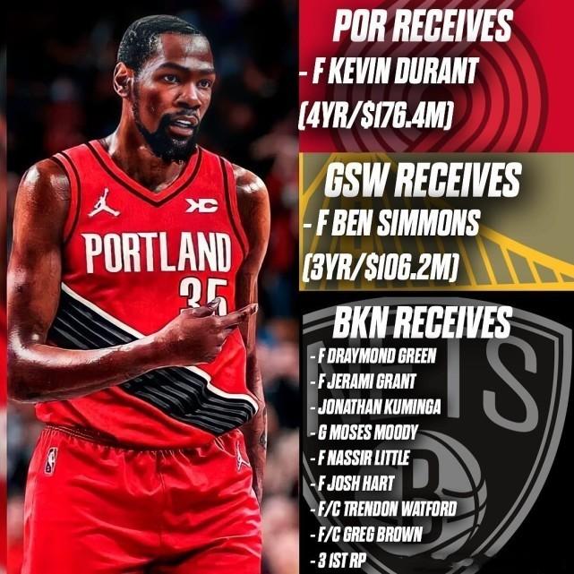 美媒晒出这笔交易若达成,勇士的潜在首发是库里、汤普森、维金斯、本-西蒙斯、怀斯曼,而开拓者的潜在首发将是利拉德、安芬尼-西蒙斯、温斯洛、杜兰特和努尔基奇。