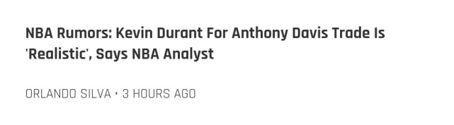 Andy Bailey在最近的文章中列出了杜兰特交易筹码的7个选项,而戴维斯在其中排名第三,仅次于绿军的布朗和猛龙的巴恩斯。此前,一位联盟内部人士曾认为,湖人应该同时交易戴维斯和威斯布鲁克,力争从篮网换来杜兰特和欧文,他认为湖人用这两位球星再搭上选秀签,就能得到篮网的双核。
