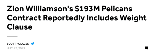 目前,在数据网站上,锡安显示的体重是284磅(128公斤),他需要继续控制体重和体脂率,才能拿到足额的薪水。
