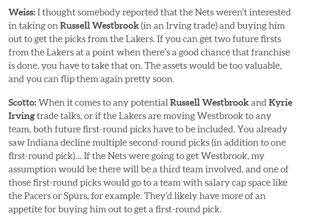 NBA记者Michael Scotto则表示,如果湖人想将威少送至任何球队,就必须搭上两个未来首轮签。如果篮网得到威少,应该会有第三方加入,例如马刺或者步行者,第三方会在吃下威少合同后得到一个来自湖人的首轮签作为补偿,随后再将威少买断。
