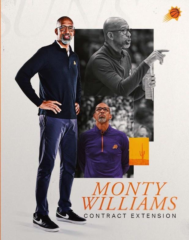 太阳官方宣布,球队正式与主教练蒙蒂-威廉姆斯签下一份多年续约合同,蒙蒂将会在未来很长一段时间内继续担任太阳主帅。