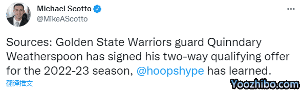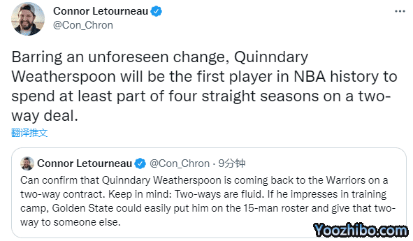 勇士夺冠成员威瑟斯庞回归,又和球队签下双向合同,名记Connor Letourneau发推写道,如果威瑟斯庞在训练营表现出色,他可以留在新赛季15人大名单上,除非发生不可预见的变化,威瑟斯庞将成为NBA史上第一位连续4年签下双向合同的球员。
