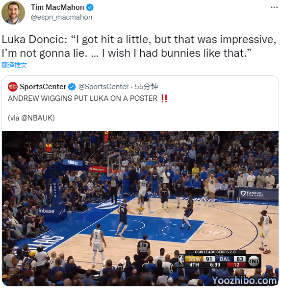 对于维金斯海报式隔扣东契奇,库里直言不可思议;库里还放话下一场终结系列赛,换句话说,库里想要4-0横扫独行侠;格林也盛赞维金斯,并表示隔扣东契奇的意义更大;汤普森则表示维金斯看起来就像“人类电影精华”威尔金斯,为他感到高兴。