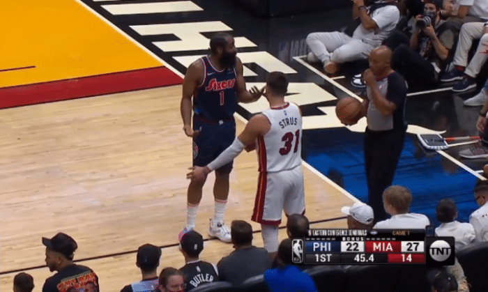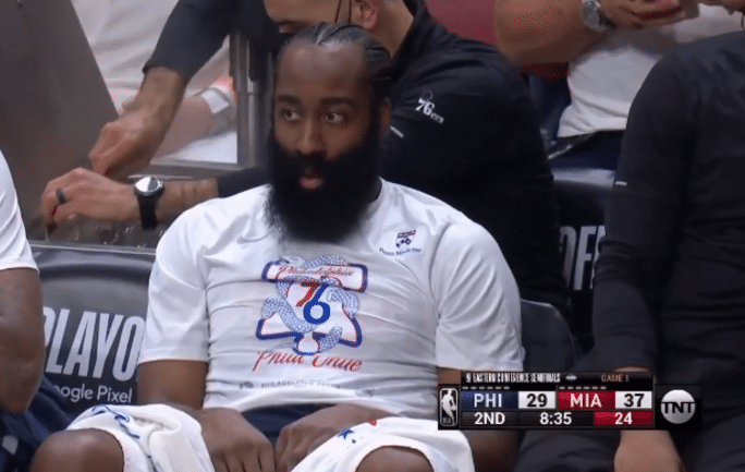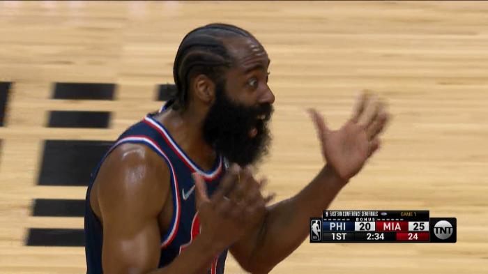 76人惨败热火!哈登13中5气得怒瞪队友泄愤,末节溃败提前投降