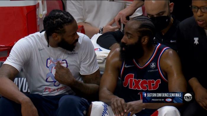 哈登首节打满12分钟5投1中拿到5分4篮板3助攻;第二节坐在场边休息时,哈登与小乔丹进行了一番交流。