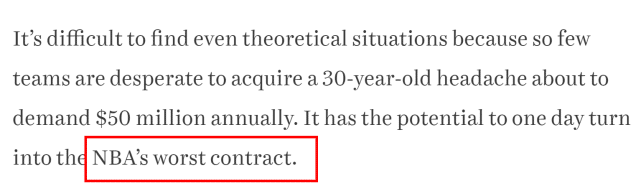 如果篮网不想留欧文,交易几乎是唯一的途径,因为他们不可能让欧文白白离开。可是,几乎没有球队愿意接手这个问题球员,更何况是以未来5年每年5000万美元左右的代价。O'Connor的结论是欧文的新合同,有可能在未来成为NBA最烂的合同。