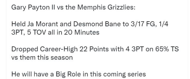 小佩顿的防守能力有多强?数据网站指出,常规赛的交锋中,小佩顿对位防守莫兰特和贝恩的20分钟里,两人累计出手17次,只命中了3球,三分球4中1,累计5次失误。进攻端,小佩顿打灰熊也有过高光表现,他的勇士生涯最高分22分,就是在本赛季对灰熊的一场比赛中拿到的。那场球,小佩顿不但得到22分,而且命中了4记三分。他确实有望在这轮系列赛里扮演一个非常重要的角色。
