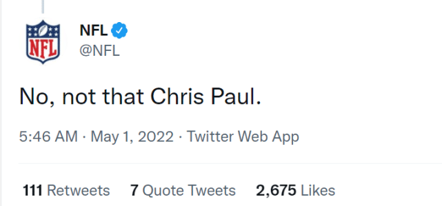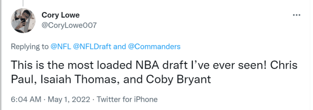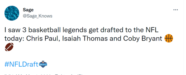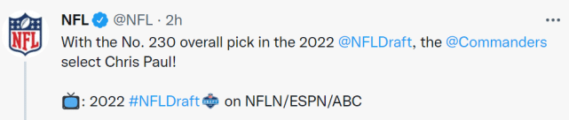 其实除了克里斯-保罗,这次NFL选秀还出现了以塞亚-托马斯(和小托马斯同名同姓)和科比-布莱恩特(Coby Bryant,与科比-布莱恩特的发音相同)。有球迷调侃这届的“NBA选秀”真是天赋满满。还有球迷表示,他看到今天的NFL选秀大会上,三位篮球传奇被选中了。