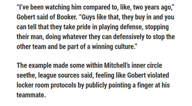 联盟消息人士表示,戈贝尔违反了更衣室的规定,公开指责他的队友,他的言论彻底惹恼了米切尔阵营。