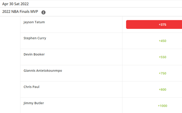第1-9位:1.塔图姆(+375)、2.库里(+450)、3.布克(+550)、4.字母哥(+750)、5.保罗(+800)、6.巴特勒(+1000)、7.莫兰特(+1500)、8.恩比德(+1600)、9.杰伦-布朗(+1800)