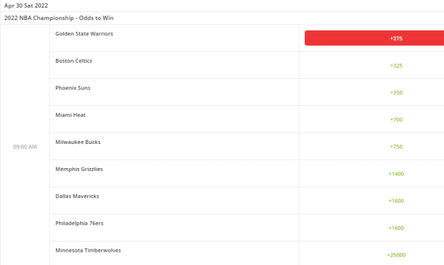 总冠军赔率也有所变化。最新的夺冠赔率排名如下:1.勇士(+275)、2.凯尔特人(+325)、3.太阳(+350)、4.热火(+700)、5.雄鹿(+750)、6.灰熊(+1400)、7.独行侠(+1600)、7.76人(+1600)、9.森林狼(+25000)