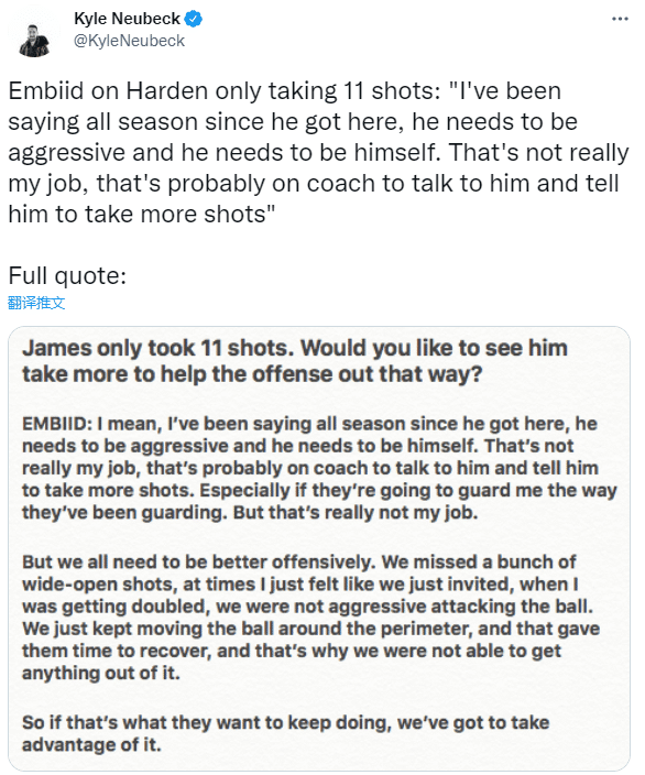 G5输球赛后,恩比德谈到哈登全场仅出手11次,表示:自从他本赛季来到球队后,我一直都希望他打得更有侵略性一些,他需要去做自己。劝哈登多出手是里弗斯的工作;当我被包夹时,我们的进攻打得不够侵略性。我们只是在外线把球传来传去,给了对手落位的时间,这就是为什么我们在进攻端打不出任何东西。