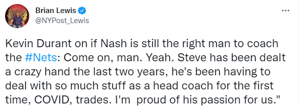 赛后被问到纳什是否仍然是篮网主帅的合适人选,杜兰特表示:别这样,兄弟,我的意思是, 史蒂夫在过去的两年里遭遇了疯狂的交易,第一次作为主教练,他不得不处理这么多的东西,,遇到了新冠疫情和各种交易,我为他对我们的热情感到骄傲,我依然相信他的领导这只球队的合适人选。