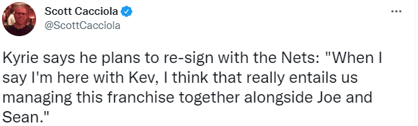 谈到续约,欧文还表示:当我说我会和杜兰特一起留在这里时,我认为这意味着我们和蔡崇信、马克斯一起管理这支球队。