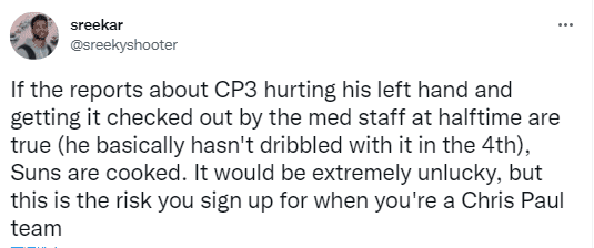 为何保罗突然状态全无?鹈鹕随队记者Oleh Kosel报道,在中场休息时,保罗看起来不舒服,每一次投篮后他的左手都不适;NBA球迷sreekyshooter赛后提到这件事,发推写道:如果关于CP3伤了他的左手并在中场休息时让医务人员检查的报道是真的(他在第四节基本上没有带球),太阳队就完蛋了!这将是非常不幸的!