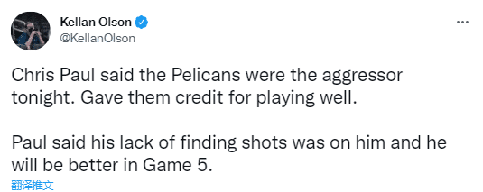 赛后谈到本场比赛,保罗表示:今天我找不到出手机会,这是我自身的问题,我会在G5设法修正;保罗还表示鹈鹕今天打得很有侵略性,打得很棒,要给他们赞扬。