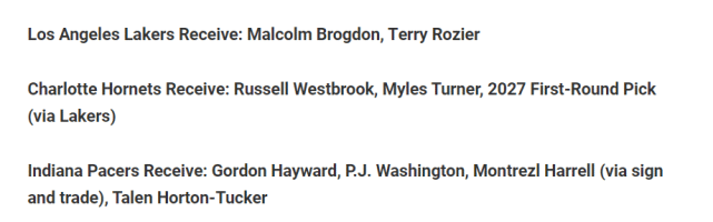 美媒认为这笔三方交易方案能让湖人、黄蜂、步行者各取所需,达到三赢的效果。方案具体内容如下——