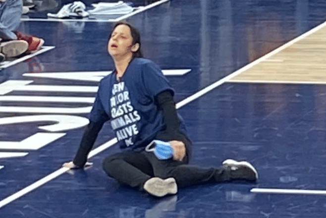 场上发生突发事件,比赛被迫暂停;在森林狼主场,自从附加赛以来,这已经是第3次发生类似的事,此前有女球迷用胶水把自己粘在地板上,还有女球迷用铁链把自己拴在篮架上。