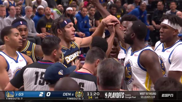 来源:360直播04-25 10:47360直播04月25日讯 ,NBA季后赛勇士和掘金系列赛G4正式开打,开场仅打40秒,场上发生冲突事件,格林戳到约基奇的眼睛引冲突,戈登和格林发生肢体接触,被拉开后隔空互喷,两人都吃到技术犯规。