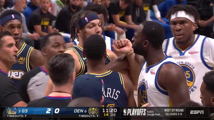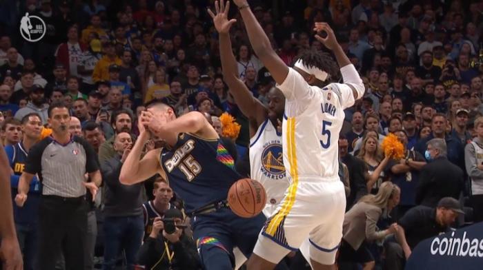 勇士和掘金系列赛G4,第一节11分20秒,勇士夹击约基奇,格林在协防时戳到约基奇的眼睛,约基奇捂着面部十分痛苦;格林和裁判沟通时,戈登为约基奇抱不平,两人的手臂缠在一起并且互喷垃圾话,被拉开后依旧隔扣互喷,裁判回放之后吹罚双方技术犯规,格林戳到约基奇眼睛只是普通犯规。