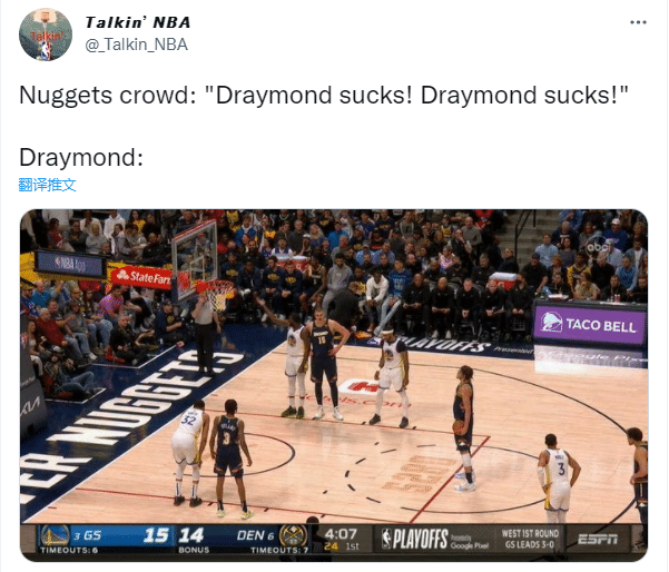 第一节4分多钟,戈登执行罚球时,掘金主场的球迷怒骂:德拉蒙德垃圾,德拉蒙德垃圾;对此格林做手势回应,挥手示意让骂声来得更多、更猛烈一些,之后格林下场休息。