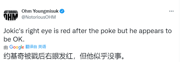 约基奇的眼睛被打红了,所幸伤势无碍,继续参加比赛;今日一战,约基奇打出MVP级别的表现,第一节出战11分钟,9投6中、三分2中2独砍18分6篮板1助攻,进攻手感火热,单节18分“杀红眼”,掘金首节26-21领先勇士5分。