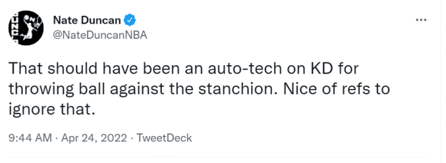 第四节,塔图姆面对杜兰特的防守打成2+1,让杜兰特情绪失控,拿起球就砸向篮架。名记内特-邓肯表示,这本该是一次自动技犯,但裁判选择忽视了!