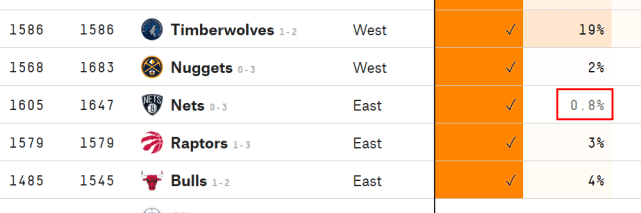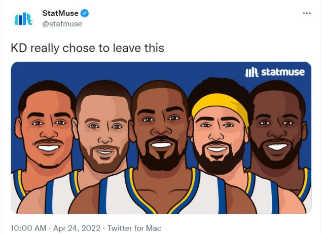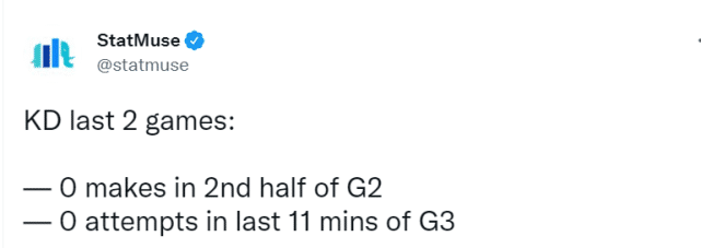 史上还没有一支球队能在0-3落后的情况下翻盘,538数据网为篮网列出的翻盘概率是0.8%!看到杜兰特目前的尴尬处境,StatMuse更扎心,晒出勇士的图调侃:“KD真的选择离开这样的阵容。”
