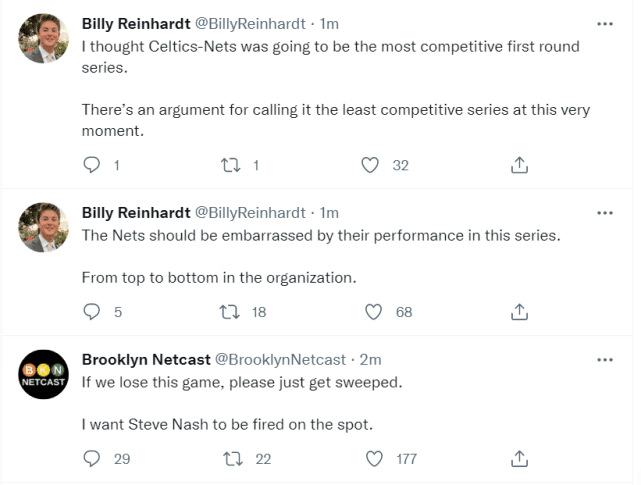 篮网跟队记者Billy写道:“我原以为篮网和绿军的系列赛是首轮最激烈的,现在来看,这可能是最不激烈的了。”他还写道:“这轮系列赛的表现,应该让篮网整支球队从上到下都感到难堪!”篮网媒体Brooklyn Netcast在比赛中就写道:“如果我们输了这场(G3),求横扫!我想要纳什马上被炒掉!”