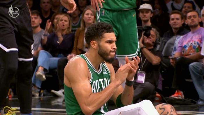 第二节凯尔特人拉开分差,9分54秒杜兰特上场,持球进攻却因撞倒塔图姆而吃到进攻犯规,此时塔图姆坐在地板上鼓掌,随后杜兰特一对一单打塔图姆,干拔中投打铁;打着打着,杜兰特明显累了,面对如此高强度的防守,而且出场时间很高,KD一脸疲态;篮网半场50-53落后3分。