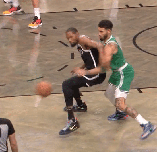 杜兰特第一节打满12分钟仅仅出手2次,2中2拿到5分,又是被防得太难受,期间杜兰特刚拿到球,塔图姆和怀特便冲过来包夹并且下手抢球,裁判吹罚怀特犯规,对此杜兰特怒吼十分生气,也凸显出KD的无奈和沮丧。
