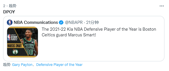 2、斯玛特成为1996年加里-佩顿之后首位夺得DPOY的后卫球员,NBA近26年第一位获DPOY的后卫。