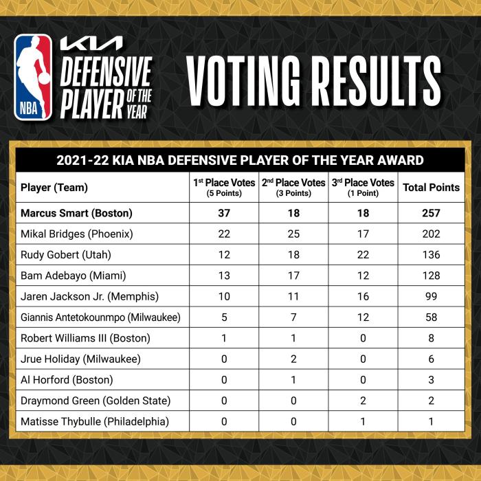 总共11名球员获得选票,凯尔特人队有三名球员上榜,其中斯玛特力压众人夺得年度最佳防守球员大奖。
