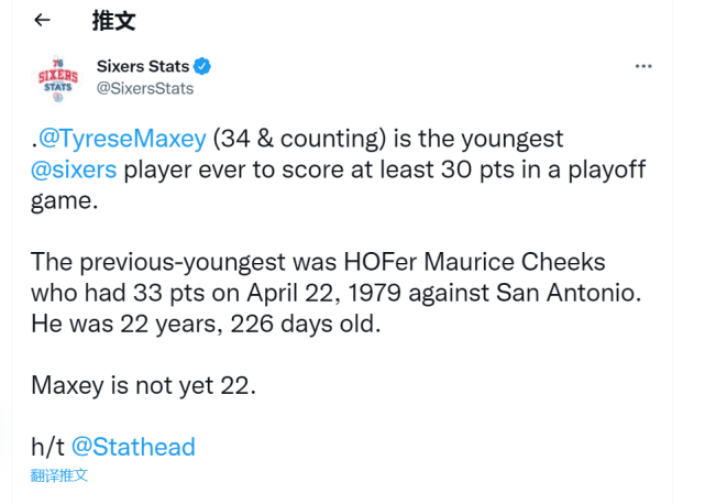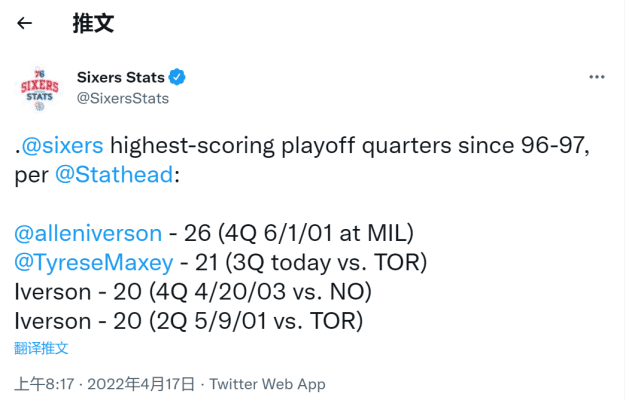 值得一提的是,马克西单节21分是费城队史自96-97赛季以来季后赛第二高的单节得分,仅次于01年艾弗森的单节26分!除此之外,马克西以21岁164天的年纪超越前辈莫里斯-奇克斯,成为76人季后赛队史单场砍下30+最年轻的球员。