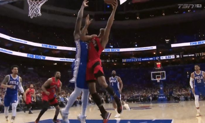 第二节猛龙5-0追分,哈登强硬突破上篮,外线单挑后撤步三分也有,76人领先到10分;恩比德、马克西和哈里斯也输送火力,76人单节34-24净胜10分,半场结束领先18分;期间恩比德防守时打到巴恩斯的面部,吃到一级恶意犯规。