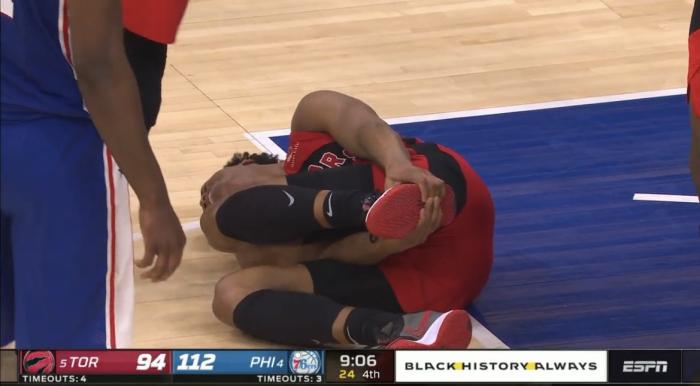 猛龙和76人比赛第四节9分06秒,巴恩斯不幸被恩比德踩到脚背,导致脚踝呈90度崴伤,随后巴恩斯捂着脚踝痛苦倒地,之后巴恩斯被搀扶离场。